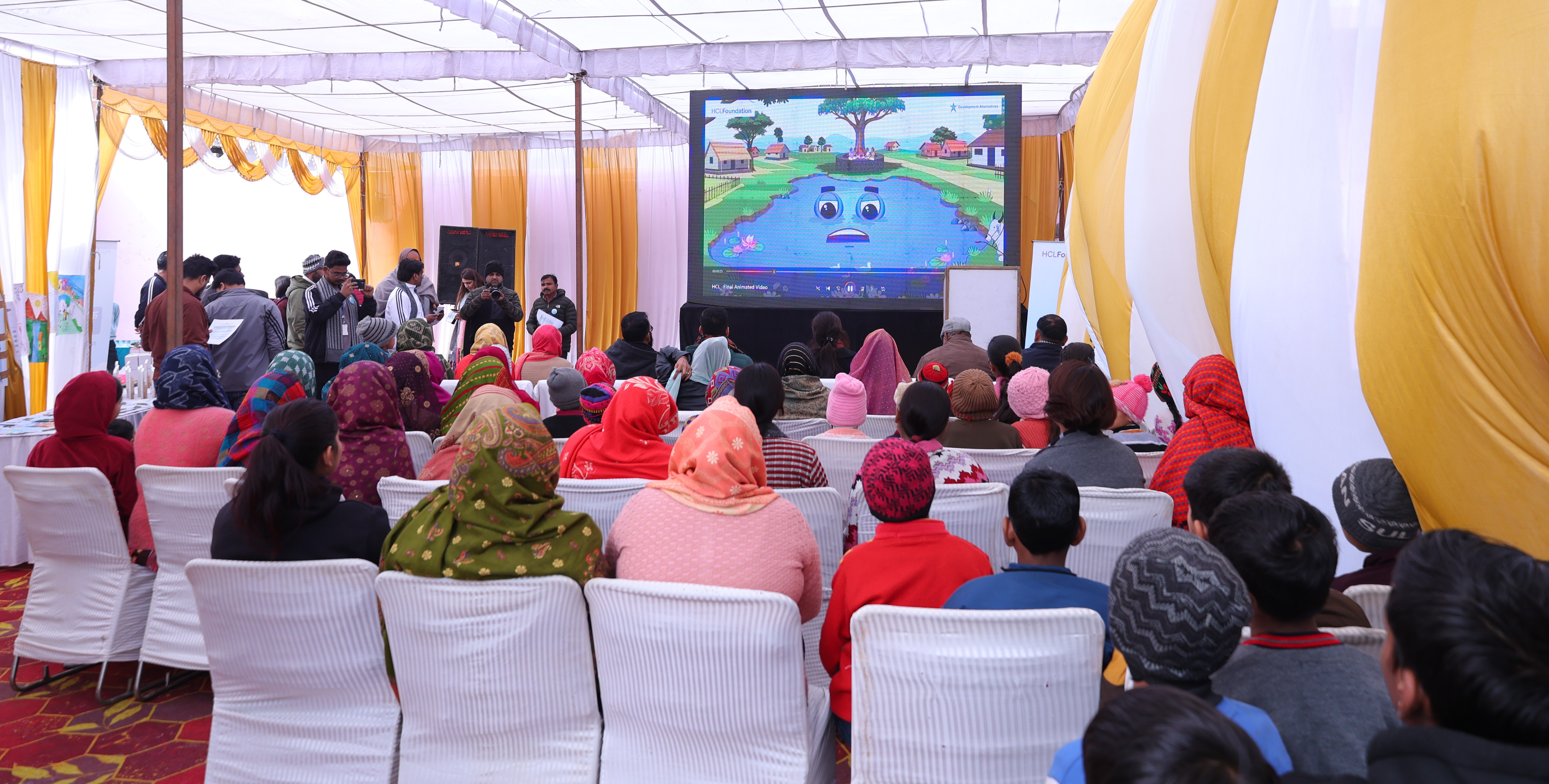 Sidipur community watching the animation movie on Pond Rejuvenation during the event